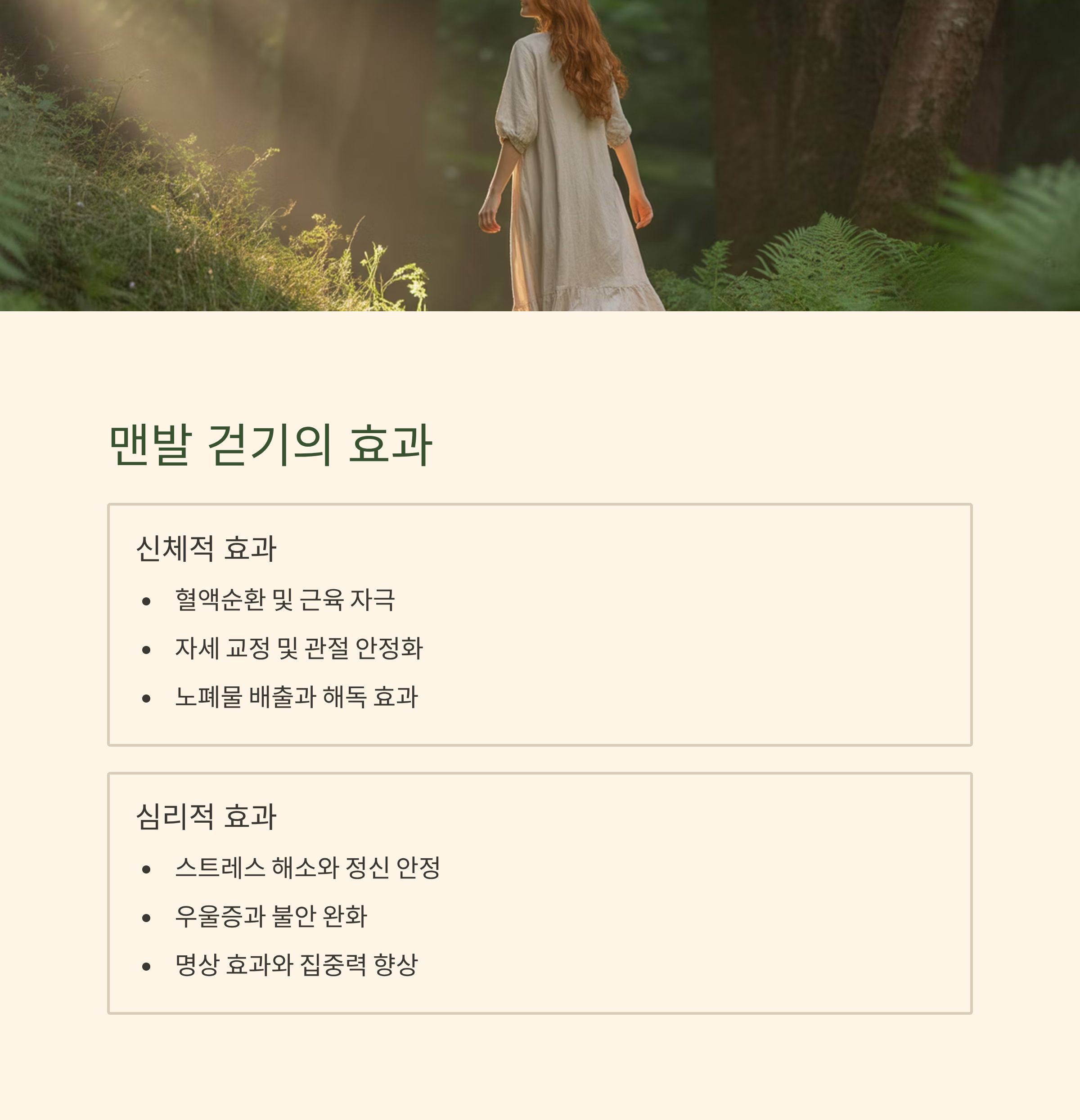 – 네, 다만 처음에는 짧은 시간부터 시작해 점차 늘려가며 몸의 반응을 살피는 것이 중요합니다. - 맨발로 걸으면 발에 상처가 나지 않을까요?